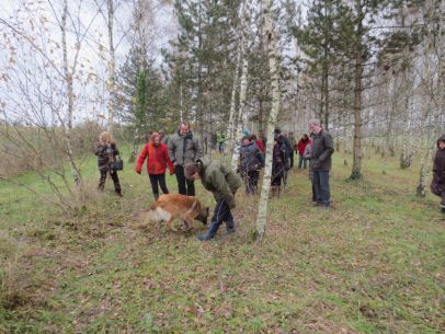 La chienne est très accaparée par le groupe mais il faut se mettre au travail, nous la suivont dans les allées plantées de bouleau et noisetiers.